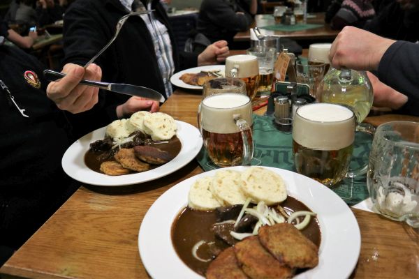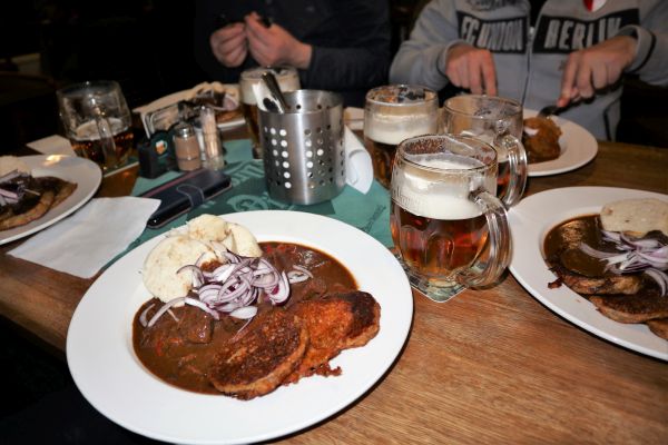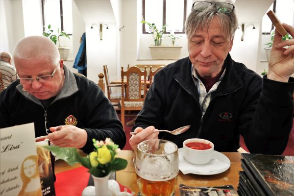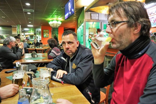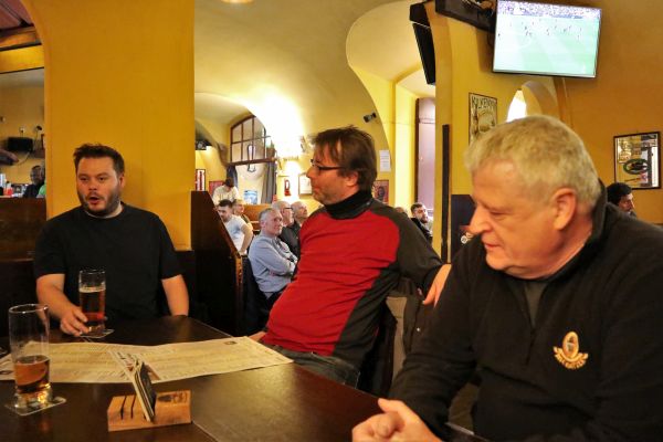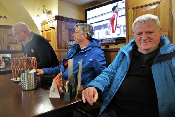 Zum Spiel. Gastgeber Sparta Prag ging als haushoher Favorit in diese Partie. Doch nach 13 Minuten führten die Gäste aus Olomouc 1:0. Und das alles andere als unverdient! Drittelpause. Auch im 2. Durchgang machten die Gäste ordentlich „Dampf“ und erzielten in der 25. Minute das 0:2. Das war dann wohl der „Weckruf“ für die Prager. Nur 8 Minuten (30. und 38. Spielminute) reichten, um alles wieder auf Anfang zu stellen. Das 3. Drittel war dann geprägt von taktischen Vorgaben, es passierte nichts mehr. Und so war es Lukas Rousek vorbehalten, im Penalty in der 66. Minute das Siegtor zu erzielen. Unsere Crew war schwer begeistert und überlegte nun, wie und vor allem wo diese Eindrücke aufgearbeitet werden können. Schnell fand sich das „Cafe Satori“, was sich nicht weit vom Hotel „Henrietta“ befindet. Natürlich gab es Knödel mit Gulasch und so manches Bier…