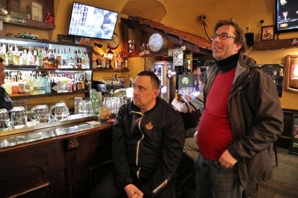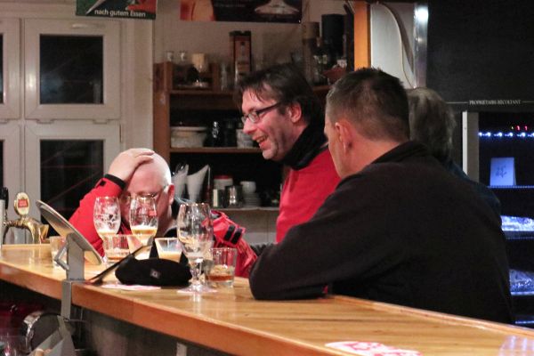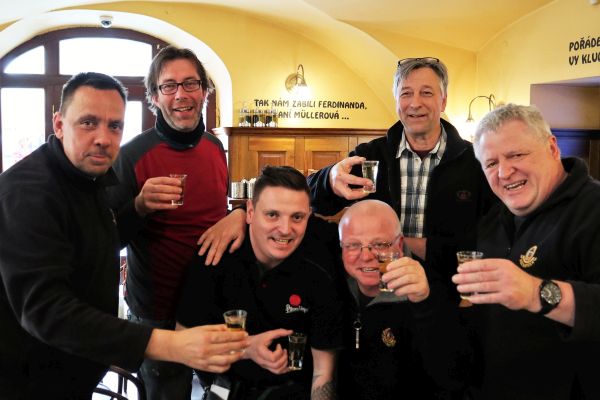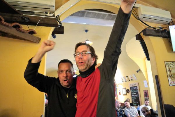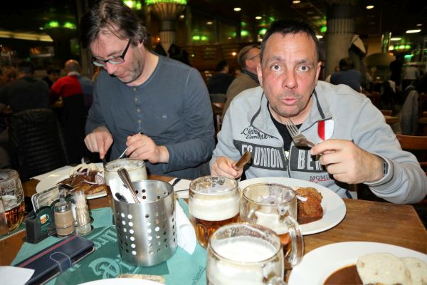 Mit der Tram gelangten unsere Jungs in das Zentrum Prags. Das Wetter war eher für eine Unterwasserfahrt geeignet. Aber den Mannen um KaLeu Christian war das egal! Maat Christian hatte alles im Griff und punktuell streifte die Crew durch Prag´s Altstadt. Ganz rein zufällig führte der Weg vorbei am „Švejk„. Unsere tapferen Helden beschlossen ganz spontan einen Boxenstopp. Und dieser sollte sich absolut lohnen! Die Zeit ging in´s Land…. Das Bier wurde immer besser. Auch der Slivovic mundete. Da unsere Mannschaft dem Frieden nicht traute, wurde in Zweiergruppen Spähtrupps gebildet. Ziel war sicherzustellen, dass keine Gefahr für die U-1966-Besatzung zu erwarten war. Und was mussten unsere Trupps entdecken? Riesige Katakomben, unterirdische Gänge. WAHNSINN!!! Eine unglaublich interessante Lokalität! Doch wie heißt es so schön: Wenn es am schönsten ist, soll Mann weiterziehen. So sollte es geschehen. Maat Christian navigierte die Crew nun zum „Antik Mucha“. Dort wurde das Spiel unserer Köpenicker Schlosserjungs im Breisgau übertragen. Zugegeben, die Jungs vom U-Boot hatten zu diesem Zeitpunkt leichte Orientierungsdefizite… Das spürten wohl auch die Fußballer, die am Ende der Partie mit leeren Händen und einem nicht ganz unverdienten 1:3 die weite Heimreise antreten mussten. An eine Rückfahrt in das Hotel war für unsere Crew jedoch noch lange nicht zu denken! Während sie noch nach Gründen der äußerst schmerzhaften Niederlage suchten, kamen die Matrosen mit den am Tisch sitzenden Engländern in´s Gespräch. Und sofort herrschte Einigkeit: Weder die Briten, und wir schon gleich gar nicht, hätten Schuld an dieser Niederlage! Gestärkt durch diese Erkenntnis, galt es mit unseren inzwischen zu Alliierten erklärten britischen Freunden auf das Wohl unseres KaLeu´s anzustoßen. Auch wenn sein Geburtstag inzwischen 3 Monate zurücklag. Aber egal. Diese Reise galt einzig und allein ihm! Und so war es dann auch der Bedienung vorbehalten, mit einer kleinen Pyroeinlage unserem KaLeu zu gratulieren. Alle im Saal stimmten ein: „Happy Birthday to you, happy Birthday to you, happy Birthday Sir KaLeu, happy Birthday to you!“ Das war dann auch der Abschluss dieses Stopps. Unsere Crew zerfiel nun leider in 2 Gruppen. Warum, das bleibt wohl das kleine Geheimnis der Reisenden… Dieser Fauxpas wurde jedoch schnell korrigiert und wie durch ein Wunder traf sich die Besatzung in der Tram. Was kann es schöneres geben? Dann wieder zum Abendmahl in´s „Cafe Satori“, danach auf einen Absacker in die „Bar Amarula“. Man könnte schon fast von Routine sprechen. Verdiente Nachtruhe!!