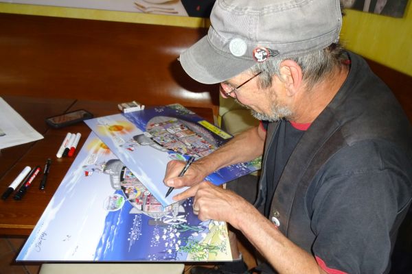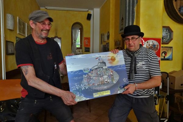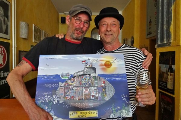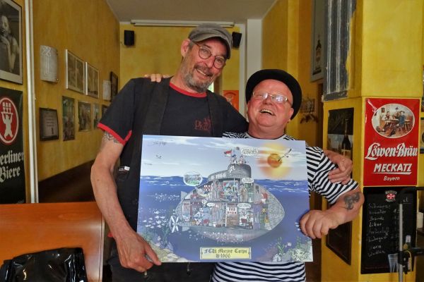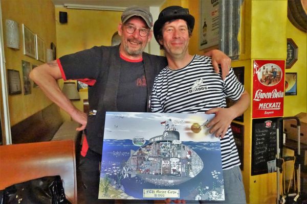 Nun zum eigentlich Höhepunkt: Die Crew zog sich in die „Matrosenstube“ zurück. Der KaLeu hatte bereits die Bilder im Marinehaus abgegeben, die Sam nun signieren sollte. Er tat dieses mit einer Begeisterung, die hier nicht in Worte gekleidet werden kann. Daher hier an dieser Stelle der Verweis auf die Fotos. Es ist noch zu früh für ein Fazit, aber solche Momente sind es, die unsere Crew die nötigen Kräfte bei ihren harten Feindfahrten verleihen! Und von denen sie sich in den nicht immer einfachen Situationen des Matrosenlebens unter Deck immer wieder aufbauen!