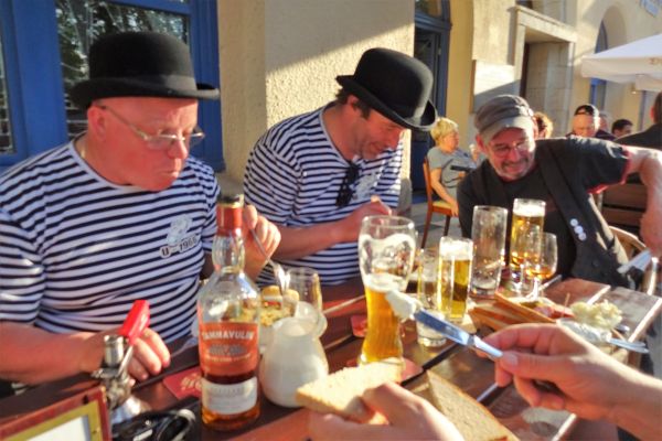 Die Zeit flog dahin und das Essen stand urplötzlich auf dem Tisch. Lecker wie immer. Gut gestärkt nahm der Abend nun seinen Lauf. Wichtig war noch die Planung einer Erfurt-Reise. Denn das wird für unsere Jungs eine absolute Herausforderung! Unser KaLeu schickt sie allein in die Schlacht. Er will mal sehen, ob das auch ohne ihn funktioniert. Natürlich ist er immer am Funkgerät und sollte es zu ernsthaften Schwierigkeiten kommen, kann er aus der Ferne Befehle erteilen. Leider kann auch Seekadett Nussi nicht. Aber mit Ernst, den manche schon in Glasgow kennenlernen durften, stellt uns der KaLeu einen durchaus jungen, talentierten Mann zur Seite, der durch die Schottlandfahrt eine nicht unerhebliche Kampferfahrung mitbringt!