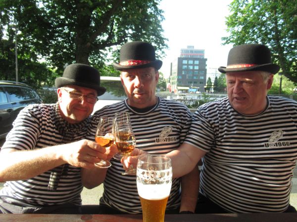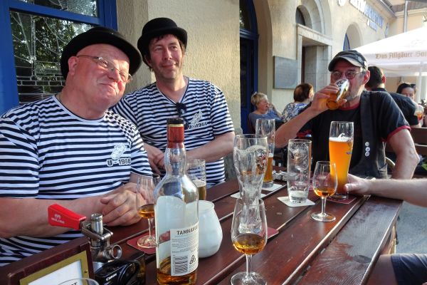 Es herrschte wieder Eintracht. Dann tauchte urplötzlich unser Freund Sam Paff auf. Wieder kurzer Nussi-Pfiff, alle stillgestanden! Freudige Begrüßung. Der KaLeu gab den Befehl zum Setzen und Obermaat Stefan fühlte sich gemüßigt, eine Flasche Whisky auf den Tisch zu stellen. Es war ihm die Erleichterung anzumerken, dass er weiter als Obermaat auf dem U-Boot unterwegs sein wird!