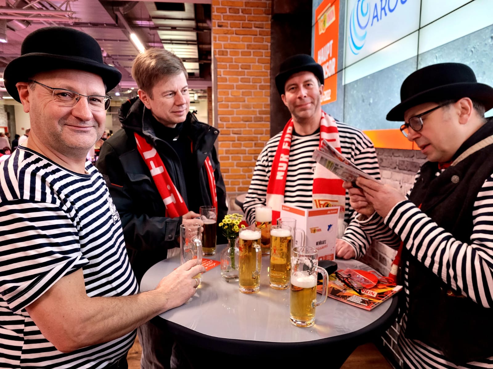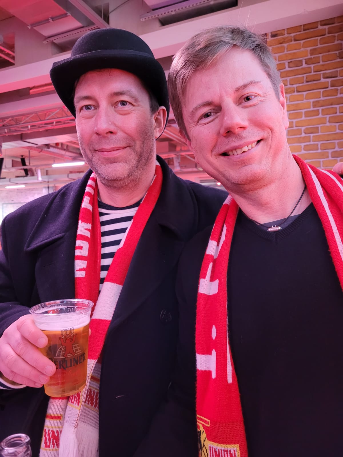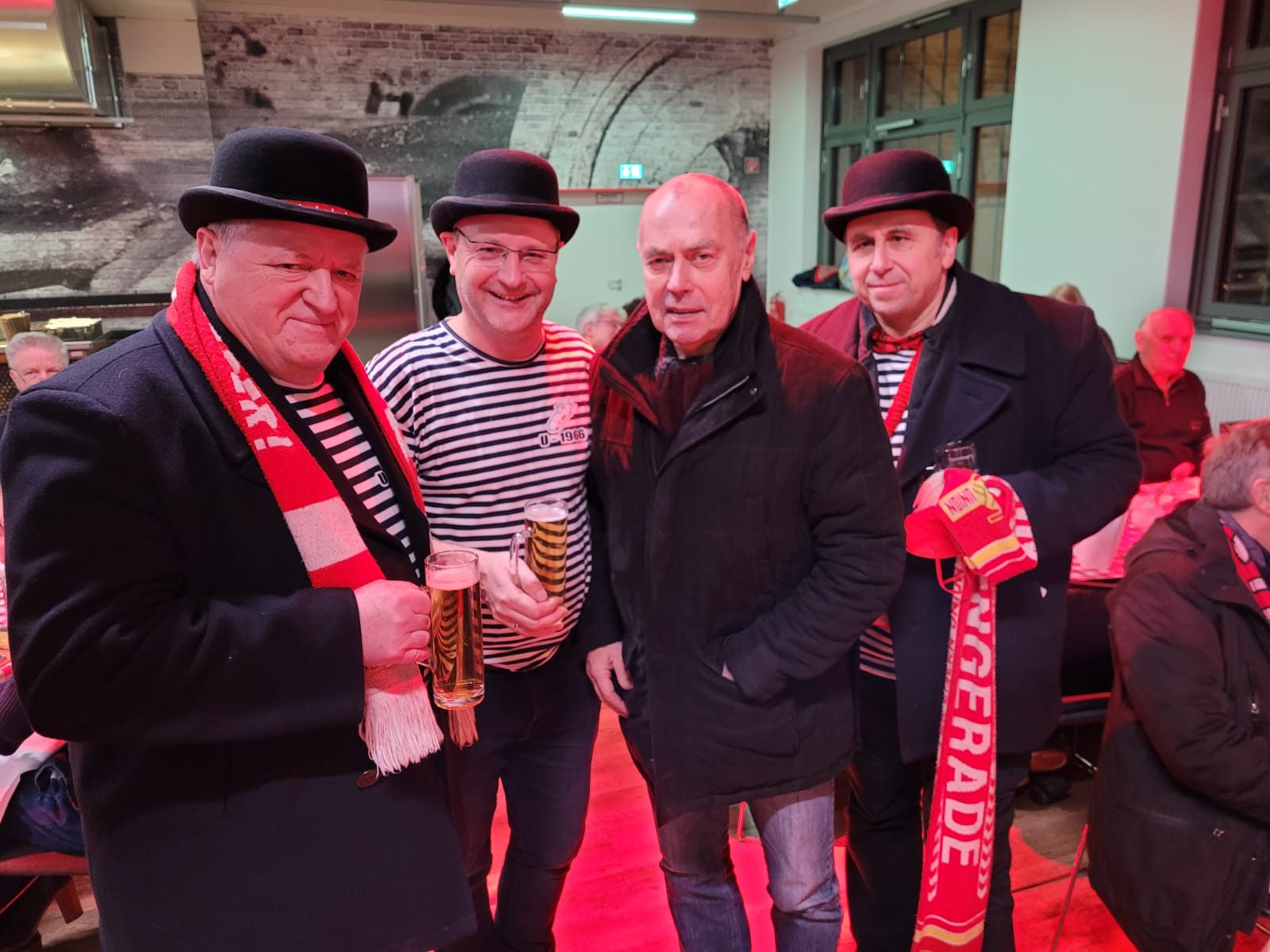 Nach dem Spiel zeigte sich unser Kaleu sehr erfreut und kein geringerer als Achim Sigusch kam zum Gratulieren in die Schlosserwerkstatt. Fotos siehe unten. Obermaat Marian im Lazarett knutschte alle vorbeikommenden Krankenschwestern, Obermaat Stefan genehmigte sich einen Obstler und Leutnant Seku zog in den „Schwarzen Adler“… Die 4 Helden von der Ehrentribüne zogen los, um Köpenick unsicher zu machen. Was für ein Tag…
