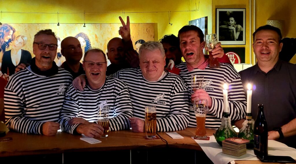 Anstoß zu Halbzeit 2. Und die ersten Minuten sollten es in sich haben. In der 47. Minute Riesenchance für Hertha. Nur 3 Minuten später unterlief Stark ein Eigentor. Das war das 0:2!! Wieder grenzenloser Jubel unserer Crew. Ehe sich unser Leutnant einen nächsten Rum einschenken konnte, stand es plötzlich 1:2 (54.). Khedira wurde zwar das Tor zugeschrieben. Aber was sollte er da machen? Egal. Ein Rum in Woringen und plötzlich trifft sogar der Knoche. Praktisch mit dem Gegenzug in der 55. Minute. Nach diesen aufregenden Minuten beruhigte sich das Spiel wieder. Union hatte alles im Griff. Hertha fiel nicht viel ein. Da war dann das 2:3 in der 90+5. Minute nur noch Makulatur. Dann war es 2238. Abpfiff. Wir stehen im Viertelfinale des DFB-Pokales. Was dann auf dem neu verlegten Rasen im Olympiastadion abging, was die 200 Gästefans ablieferten war unbeschreiblich. Im Marinehaus wurde getanzt, gesungen und auch etwas getrunken. Unser Leutnant wunderte sich, warum der Rum nahezu alle war. Obermaat Marian begann mit der Polonaise, aber das hatten wir ja schon.