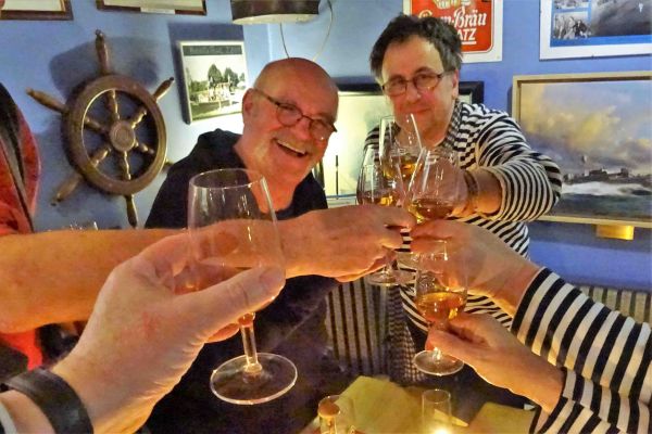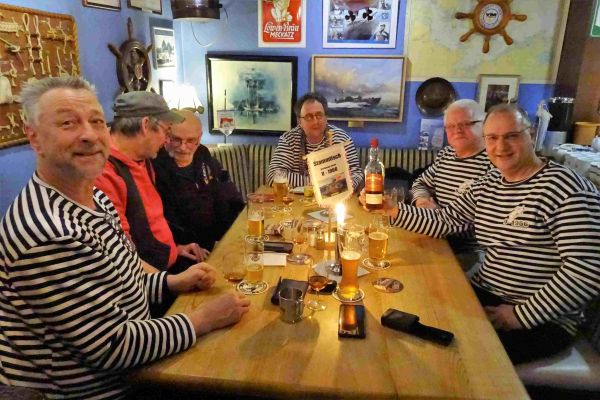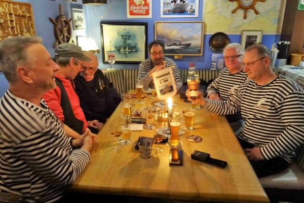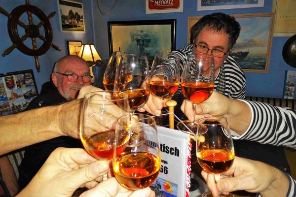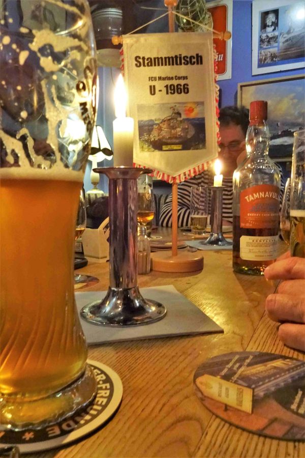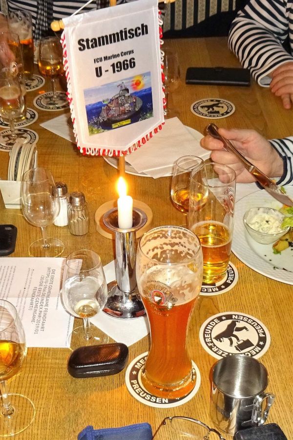 Nun zum Stammtisch. Meine geplant smarte Anreise, immer noch mit Restgrippe in den Knochen, drohte dann komplizierter zu werden. Von Ahrensfelde fährt die S-Bahn direkt zur Jannowitzbrücke in 26 Minuten. Man steigt im ersten Wagen ein und steigt direkt am Treppenabgang S-Bahnhof Jannowitzbrücke aus. Man kann so in 30 Minuten dem rettenden Meckatzer sehr nahe sein. Dann kommts. Man hört den Bordfunk des Fahrers: Polizeieinsatz am S-Bahnhof Nöldnerplatz, keine Durchfahrt möglich, Schienenersatzverkehr wird organisiert… Ich so einen Hals! Aber was soll es – man fährt erstmal los, um sich dem Ziel anzunähern. Und was passiert? Die Bahn fährt, warum auch immer, einfach durch. Ich also super pünktlich 1715 in der Basis. Dort sitzen bereits unsere Obermaats Marian und Stefan und warteten auf die Crew. Nun trudelten alle inclusive Gäste ein und der Stammtisch konnte offiziell beginnen. Der angesagte Livechat mit General Seckler wurde versucht, teilweise erfolgreich, trotz Rückkopplungen, technisch bedingten und lautstärken abhängig. Wir sind halt in einer aktiven Marinebasis und hier wird gearbeitet und gekämpft. Aber unserer Fanfreundschaft mit unserem General in Augsburg kann das nichts ändern. Wir wünschten uns abschließend ein faires kampfbetontes Spiel. Unser zweites Thema des Abends sollte unsere Leseveranstaltung sein. Auch der Hausherr der geplanten Leserei, Henri, war anwesend und wir konnten die Eckdaten festmachen. Meine Idee für eine Einladungskarte hat sofort bei Sam seine kreative Ader in Wallungen gebracht und er hat bereits den Entwurf im Kopf erzeugt, wollte dennoch nicht weiter ins Detail gehen. Unsere örtlich bedingte begrenzte Teilnehmerzahl haben wir wie folgt umgesetzt. Jedes Crewmitglied darf 2 Gäste mitbringen. Henri 4 Gäste. Wie sich mit fortschreitender Planung ergab, kommen noch Christl und Peter hinzu, die für frisches Meckatzer sorgen, wie unser Stefan für die Bockwürste mit Brötchen und Senf sorgen wird. Geplant sind dann Sitzkissen für die Zuhörer und für den Vorleser der Zahnarztstuhl. So glauben wir gut vorbereitet zu sein. Weitere Aufgabenverteilungen und finanzielle Regelungen haben wir uns für den nächsten Stammtisch aufgespart. Nach diesen erfolgreichen Aktionen hatte unser Obermaat Stefan nur eine Antwort: eine Flasche Tamnavulin, Cherry Cask! Wir konnten also den Abend angemessen fortsetzen und dann auch zu einem allseits einvernehmlichen Ende gestalten. Wir alle hatten einen wundervollen Abend, der gerade auch bei unseren Gästen Begeisterungsstürme auslöste. Wir werden wohl mit solchen Gästen zukünftig rechnen müssen. Ich selbst hatte eine störungsfreie Rückfahrt und war dann 0000 im Bett. Mein Wecker klingelte pünktlich 0530 und widererwarten war ich 0645, zum Erstaunen meines Büros auf Arbeit. Man kann sich mittlerweile auch auf die sonst so unpünktliche Bahn nicht mehr verlassen…