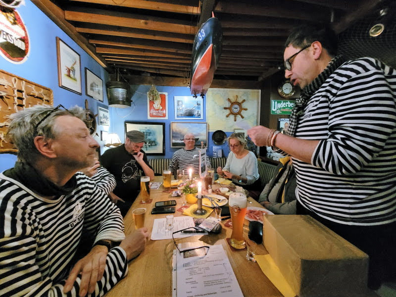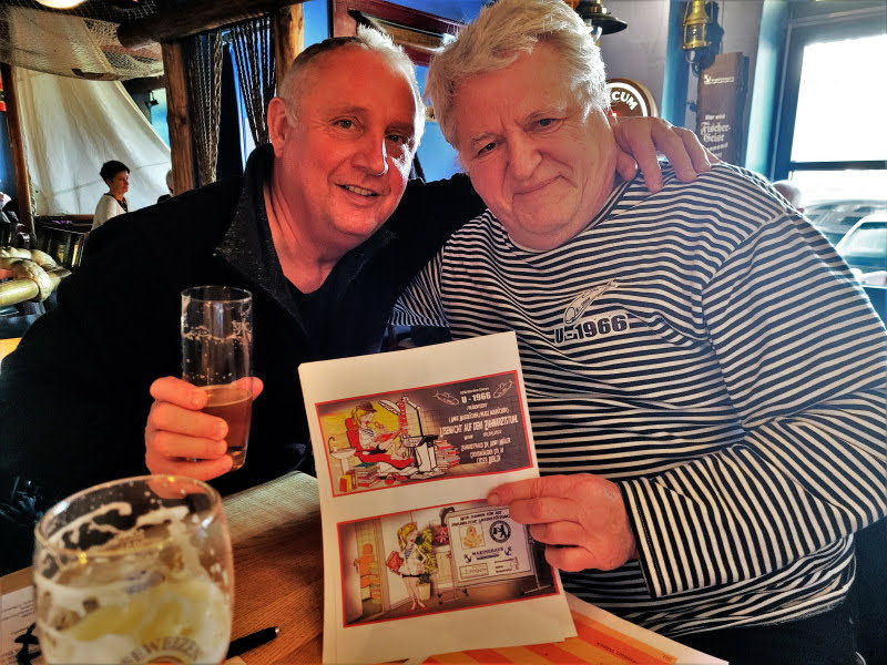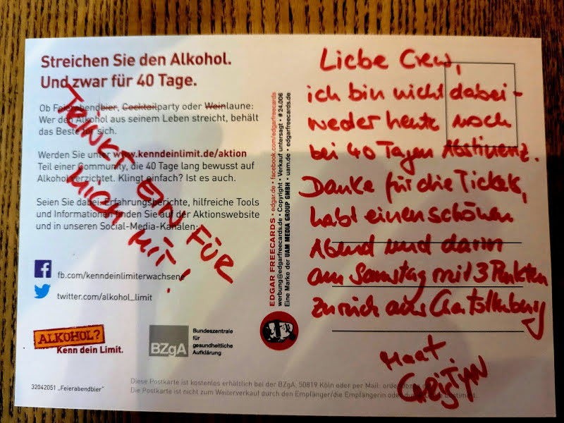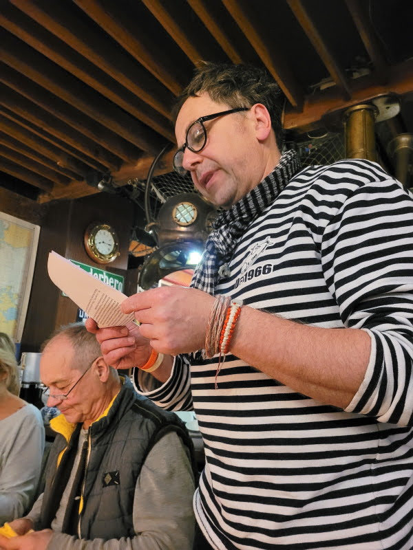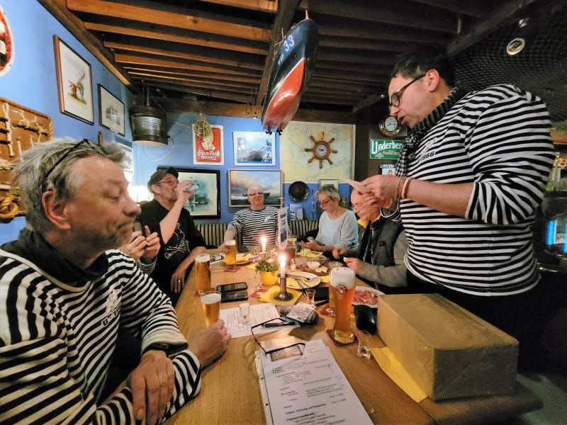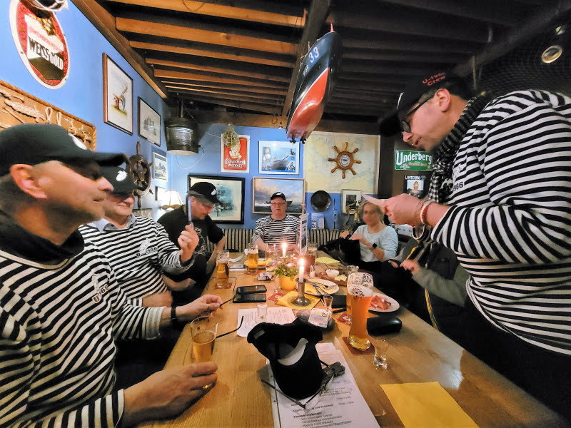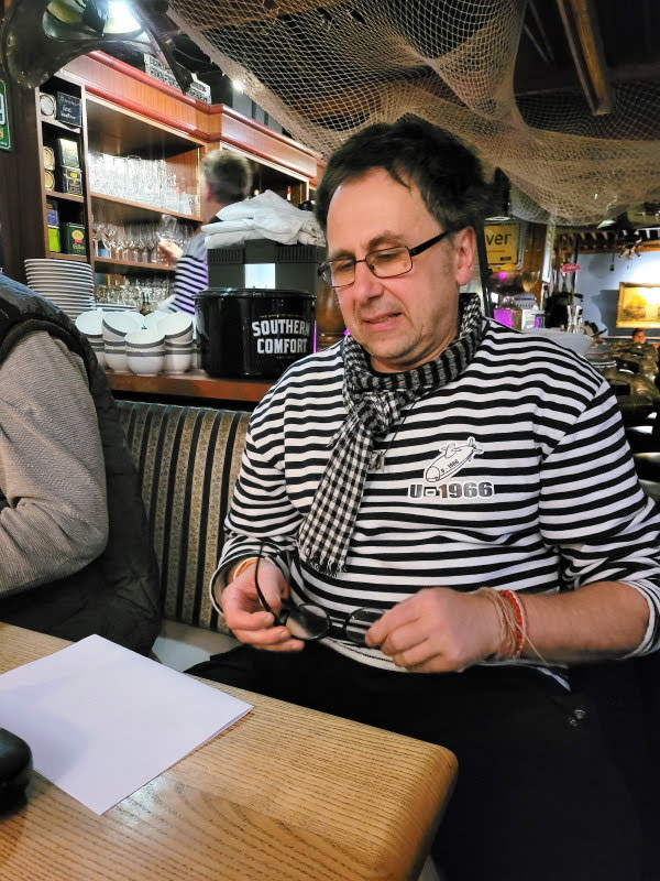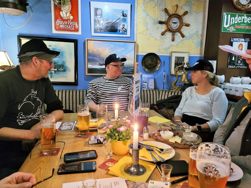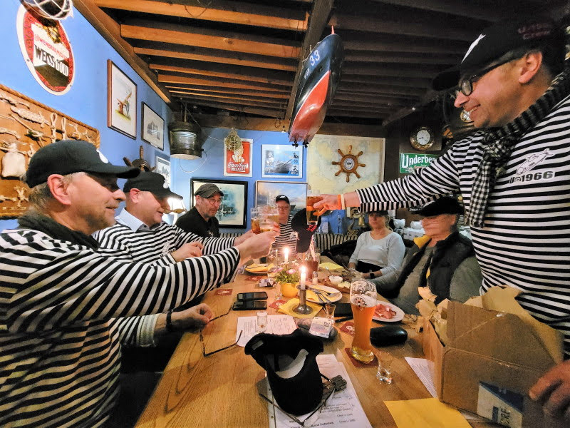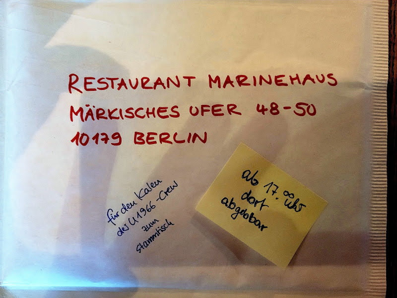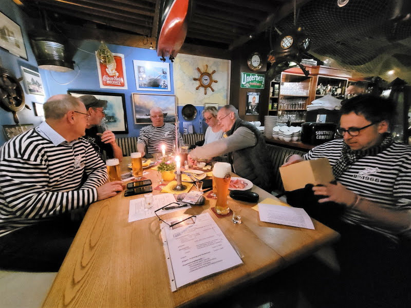 Nach dem ich den Stammtischtermin von langer Hand vorbereitet hatte, war dann alles wieder stressig wie immer. Unaufschiebbarer Termin im Büro. Limit gesetzt mit 1600 Uhr. Letztendlich hektisch 1630 aufgebrochen, in S-Bahn gehetzt und dann doch pünktlich 1700 im Marinehaus. Sekunden später ein Weizen in der Hand und angestoßen. Meine umfangreichen Vorbereitungen zur Lesenacht reduzierten sich dann durch diverse Vereinfachungen. Ergebnis folgt dann nochmal extra… Es ist eben immer wieder schön, mit konstruktiv denkenden Menschen etwas anzugehen. Soweit war alles eigentlich erledigt. Der Plan stand ca. 1830, man hätte einfach 2 bis 3 Bier getrunken und dann ab nach Hause. Aber wie immer kommt es anders, manchmal ganz anders. 1830 kommt ein Bote ins Marinehaus und sucht einen Kaleu mit Crew. Ich gebe mich zu erkennen und werde Besitzer eines ominösen Briefumschlages. Inhalt eine Grußkarte mit 40 Tage Abstinenz-Geschwafel. Völlig unverständlich! Aber auch die 2 Dauerkarten die Tilo und ich unserem Christian geliehen hatten, gepaart mit 20 € – alles von unserem Maat Christian. Nun war Stefan dran und wir bekamen Averna zum Anstoßen. Soweit eine gelungene Überraschung. Nun kommt Nussi, der darauf besteht, dass auch Tilo dabei sein muss. Tilo kommt dann viel zu spät, Spannung wächst unerträglich bis ca. 1930. Nun kommt Nussi´s Auftritt. Ein elendig langer Brief von unserem Leutnant zur See kommt zum Vortrag. Lediglich von Zwischenapplaus und Anstoßgeräuschen unterbrochen. Dann kommts richtig dicke: die Paketöffnung. Wir sind von den Socken und müssen erstmal einen Beruhigungsschluck und den Moment genießen. Da hat doch unser allseits ge- und beliebter Leutnant zur See seine Kompetenzgrenze über alle Maßen überschritten. In einer einmalig unabgestimmten Aktion hat er der gesamten Crew zur Sprachlosigkeit verholfen. Schönen Dank auch. Nun saß die Crew, nebst Christel und Peter, völlig neu behutet und feuchtfröhlich beisammen. Was für ein Anblick! Was für eine Überraschung! Es wurden dann noch einige Meckatzer auf das Wohl von unserem Leutnant angehoben und der Abend wurde dann wieder mal länger als geplant. Und schön war es!!! Nun haben wir zwei Uniformvarianten. Winteruniform mit Mantel, Melone, T-Shirt-lang und für die warme Jahreszeit T-Shirt-kurzärmlig mit Basecap. Unsere Ausrüstung ist unvergleichlich und erregt Aufsehen, was wir eigentlich immer vermeiden wollten, denn unsere Mission ist äußerst geheim und muss in in aller Stille vollzogen werden. Dazu dann wieder mehr im neuen Tagesbefehl…