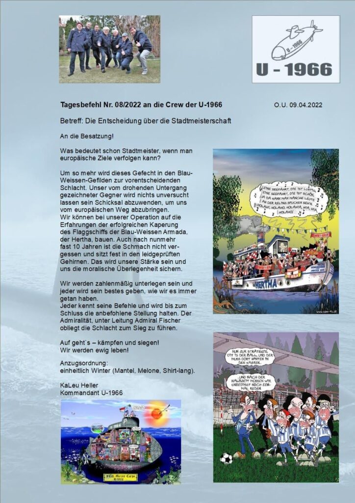 Unser Kaleu hatte die Marines strategisch an den wichtigsten Punkten eingeteilt: Er überwachte höchstpersönlich von seinem Headquarter das Geschehen. Leutnant Seku hielt wie gewohnt die Stellung im südlichsten Außenstützpunkt „Illerschleife“ die Stellung. Obermaat Marian sollte von seinem trauten Heim sein Bestes geben. Obermaat und Smutje Stefan hatte die Aufgabe, eventuelle Spione der „ALTEN DAME“ im Marinehaus in Schach zu halten. Seekadett Nussmann war nach seinem sensationellem Auftritt am Donnerstag ebenfalls für den Innendienst eingeteilt. Blieben noch die beiden Maate Tilo und Christian, die im Stadion für die Überwachung eingeteilt wurden. Diese Strategie ging in allen Punkten auf. Hier nun die Details: