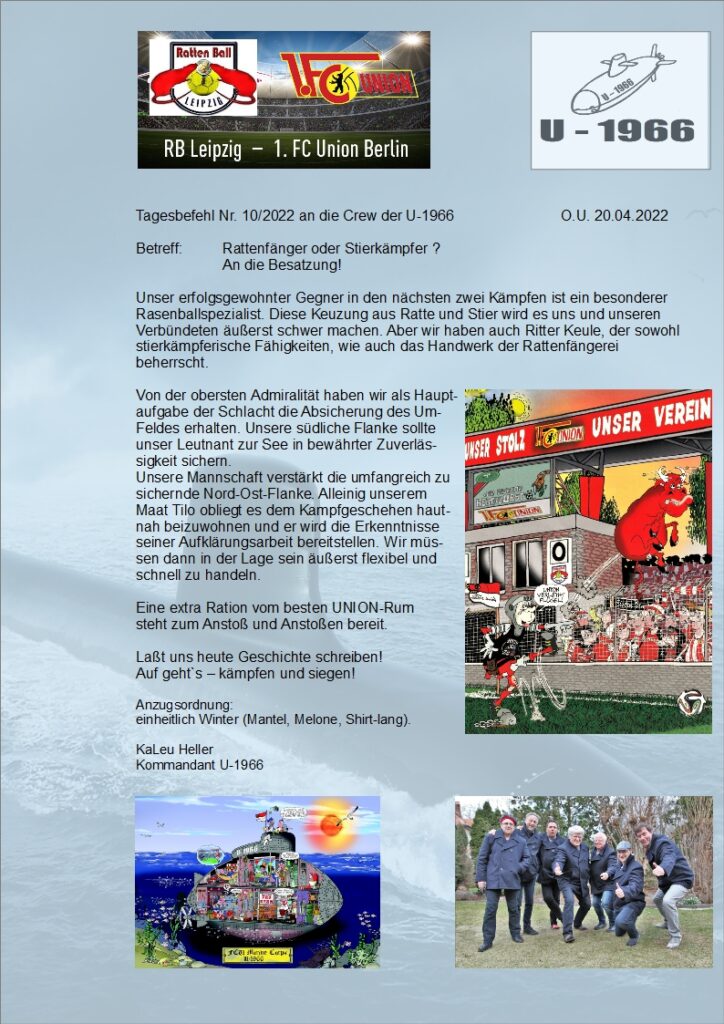 Ohje, als ich vorhin mit unserem Kaleu telefonierte, stellte sich heraus, dass selbiger flachliegt. Eventuell Corona? Was für ein Mist! Waren wir etwa für das Spiel bei dem Brausekonstrukt aus Markkleeberg führungslos? Nein, denn in weiser Voraussicht erließ er folgenden Tagesbefehl:
