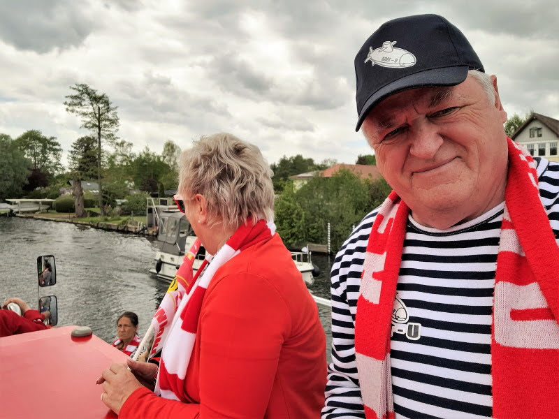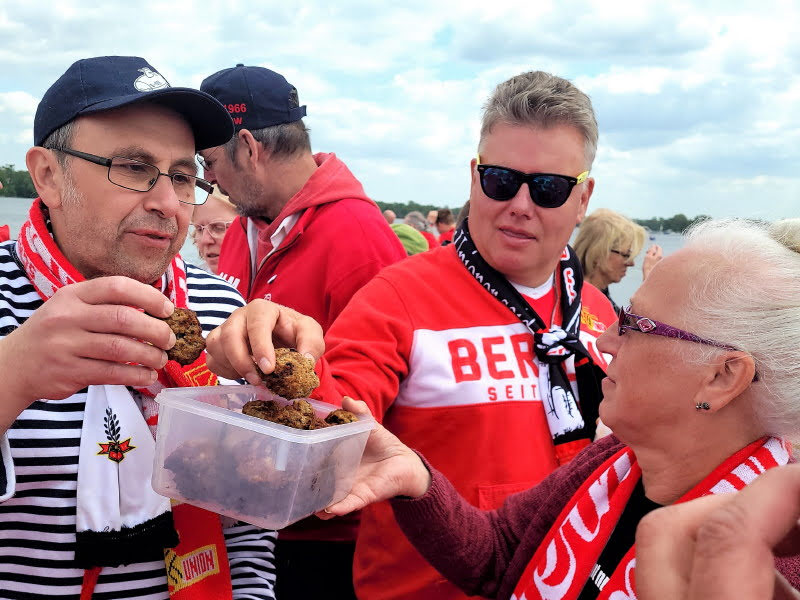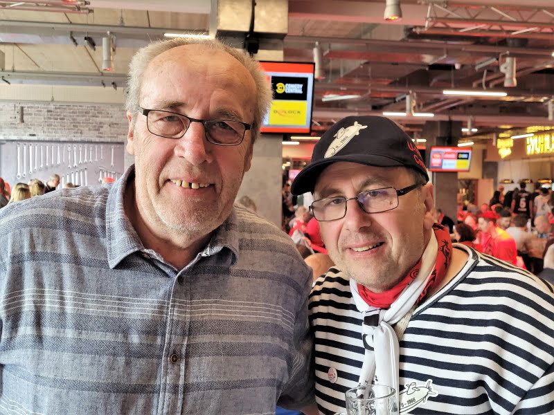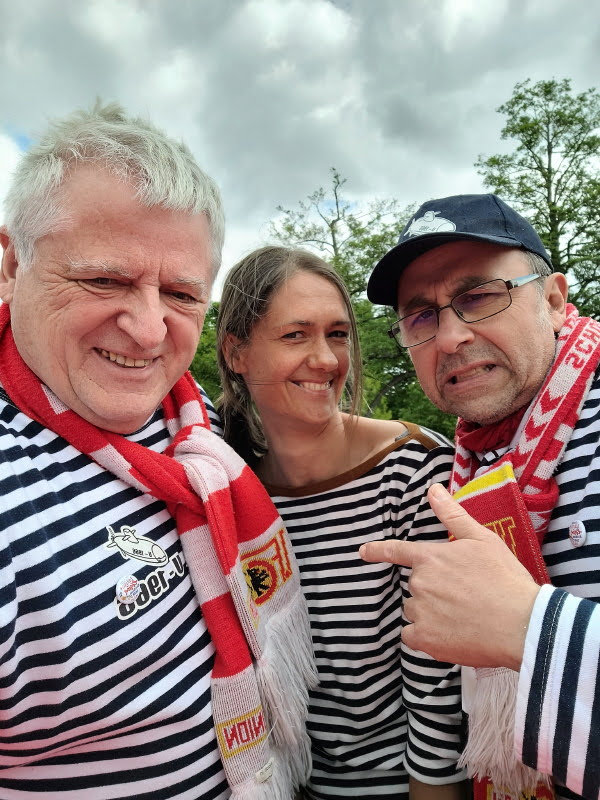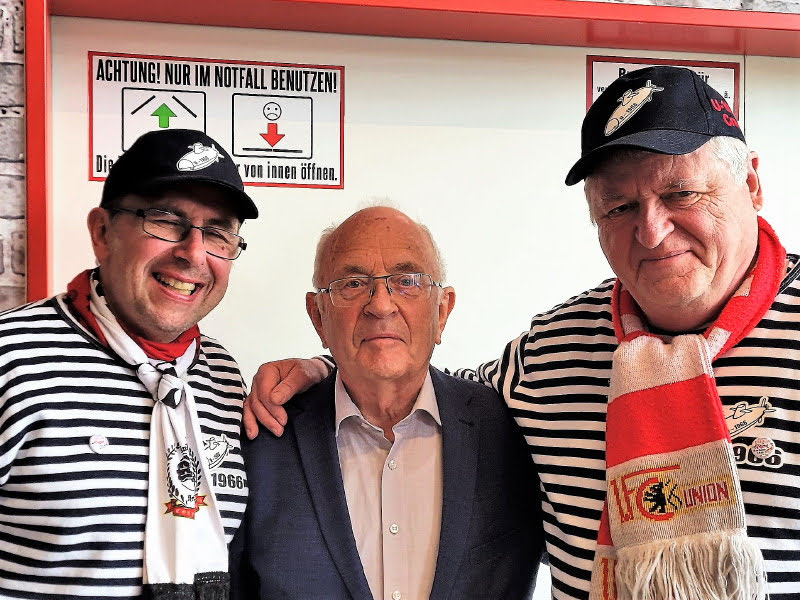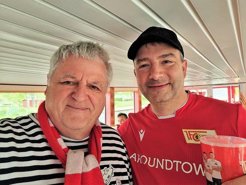 Und so begab es sich, dass ein Dreierteam, bestehend aus dem Kaleu, Seekadett Nussmann und Maat Tilo, den Seeweg zur Anreise nutzte. Leutnant Seku saß wie befohlen in Woringen und versuchte traditionell mit Meck-Weizen und Union-Rum (never change a winning team!!) seine Nervosität etwas in den Griff zu bekommen. Dies gelang jedoch nicht wirklich. Unsere Spree-Seefahrer erreichten dann gemeinsam die geliebte Alte Försterei. Dort trafen sie keine Geringeren als Heinz Werner und „Potti“ Matthies.
