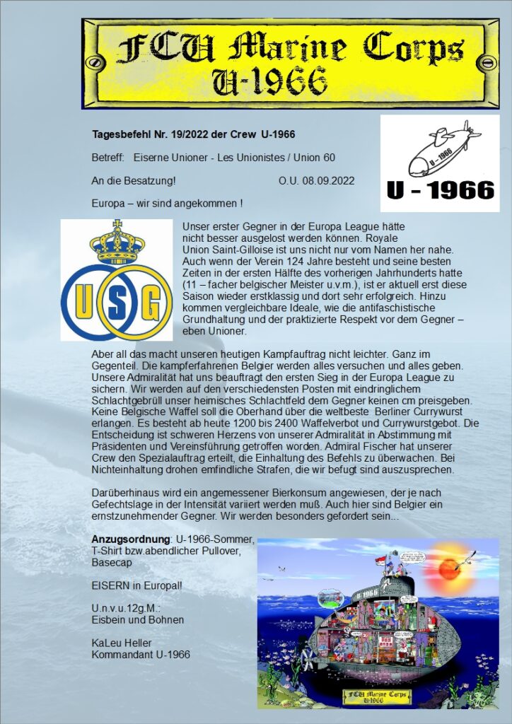 Beide Teams kamen unverändert aus den Kabinen. Das Team um Admiral Fischer hatte das Gegentor noch nicht richtig verdaut. Es brauchte bis zur 55. Minute, ehe etwas Gefahr vor dem belgischen Tor entstand. Eine Flanke von Nico köpfte Behre auf das Tor. Aber der Torwart war zur Stelle. Unser Admiral tauschte sich dann in der 58. Minute schnell mit dem Kaleu aus. Dieser war ja einmal mehr der lange Arm, stand in ständigem Austausch mit seiner Crew. Ob in Kanada, im Unterallgäu, Sektor 3, Ehrentribüne, … An allen strategisch entscheidenden Punkten hatte der Kaleu seine Mannschaft eingeteilt! Jedenfalls stand fest, dass Admiral Fischer etwas für die Offensive tun muss. So brachte er in der 60. Minute Andras und Svenne. Gute Wechsel, die Wirkung zeigten. Union nun offensiv einen Tacken aggressiver und zielstrebiger. Leider verpufften zu oft die Angriffsbemühungen entweder beim Gegner, oder aber auch am eigenen Mann (68. Minute – Ecke – Schuss von Svenne – Rani „klärt“…). Unser Kaleu stimmte sich abermals mit Admiral Fischer ab und so kam es in der 69. Minute zum nächsten Doppelwechsel: Julian für Trimmi und Timi für Janik. Noch blieben 20 Minuten, das Ding hier zu drehen. In den folgenden 10 Minuten versuchten es unserer Köpenicker aus verschiedensten Positionen. Aber alles vergebene Liebesmüh. Die Abschlüsse waren katastrophal. In der 82. Minute wechselte unser Trainer erneut. Jamie kam Danilho. Also Abwehrspieler raus, Angreifer rein. Volle Attacke!!! Aber irgendwie war heute der Wurm drin. Es gab einfach keine zwingende Torchance. Es gab dann auch noch „GELB“ für Andras und obendrein nach einem VAR-Eingriff den „ROTEN“ Karton für Sven.