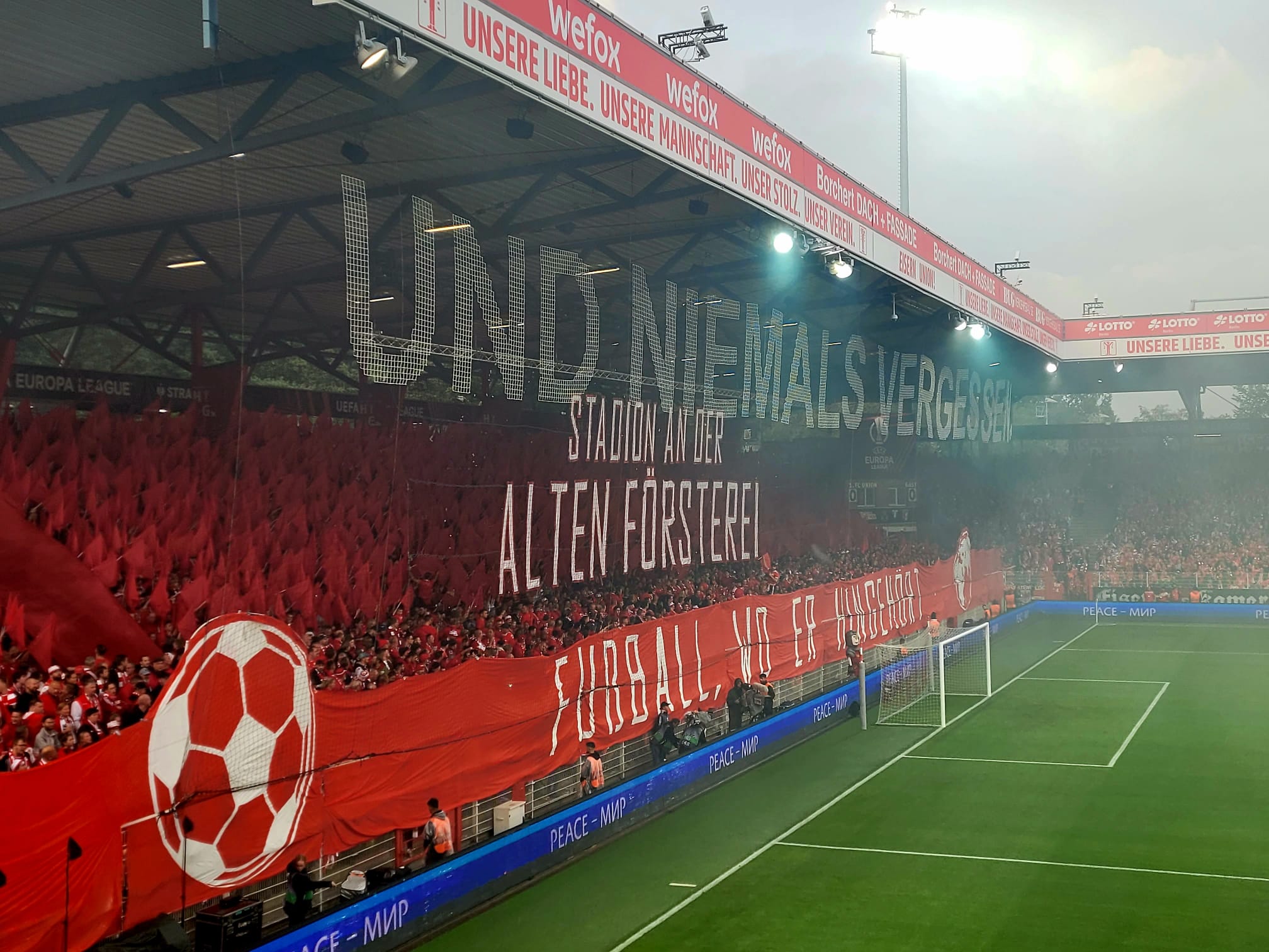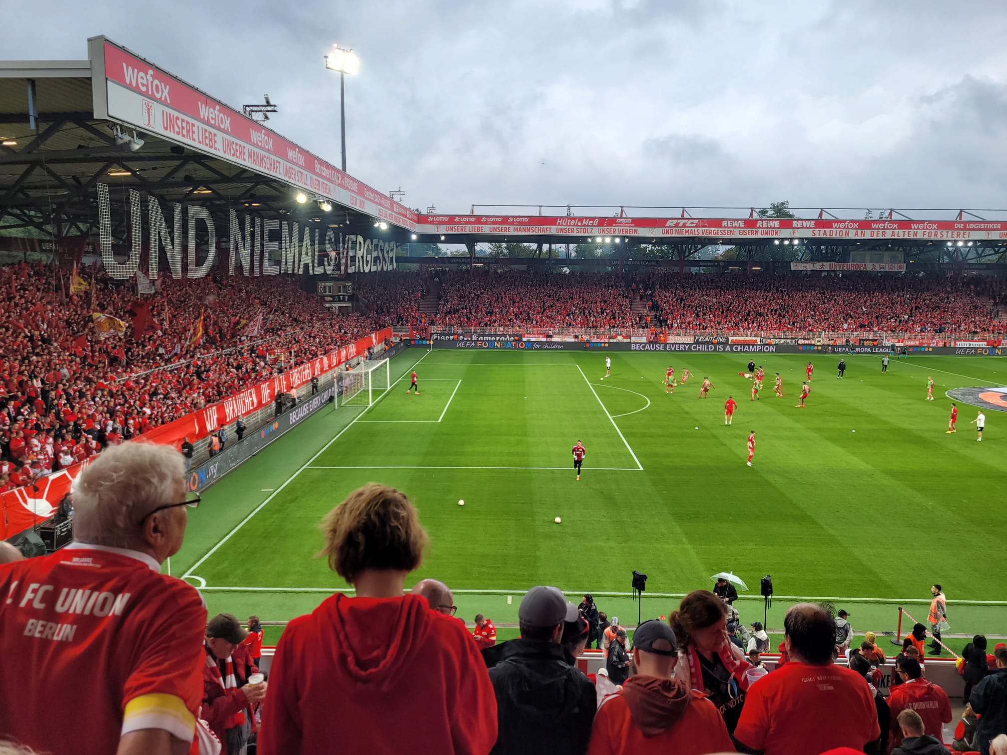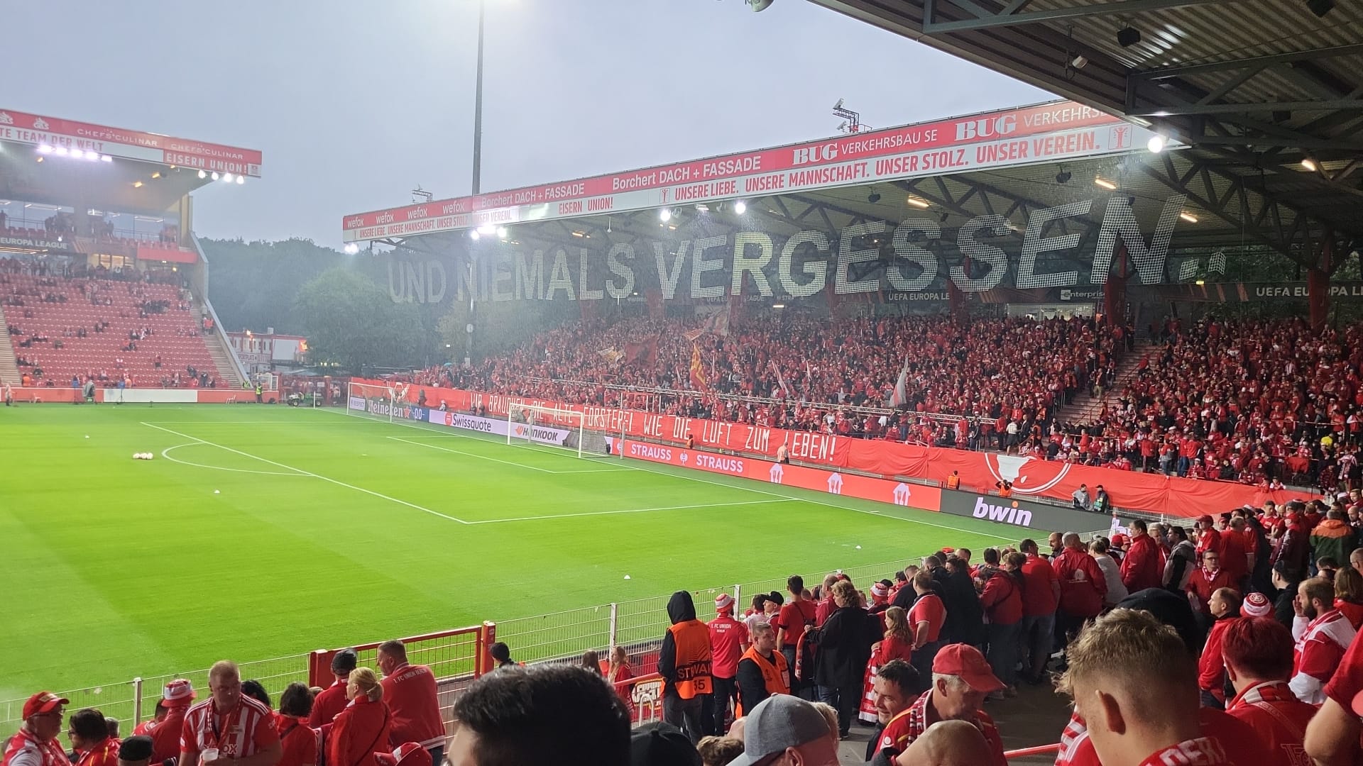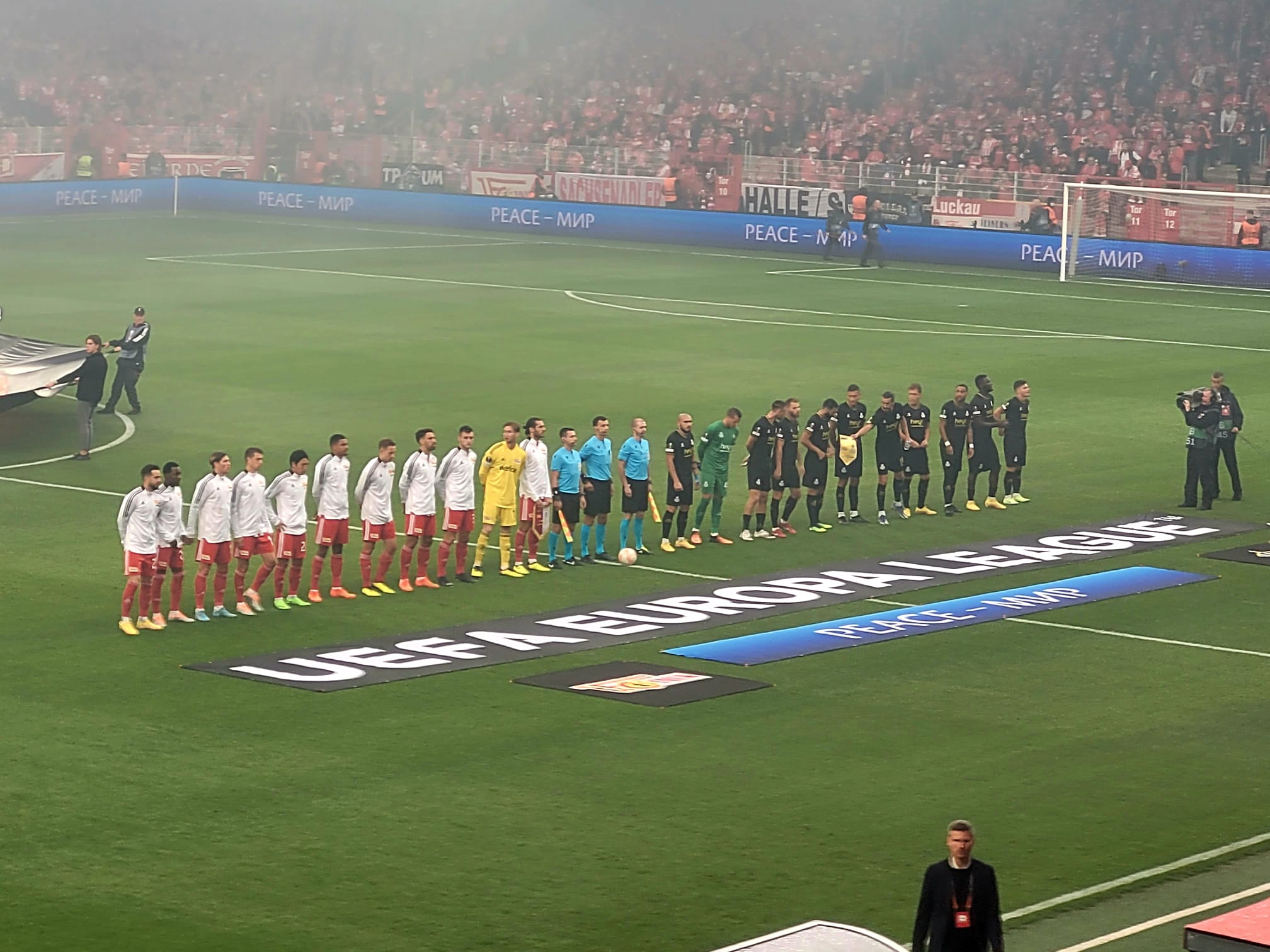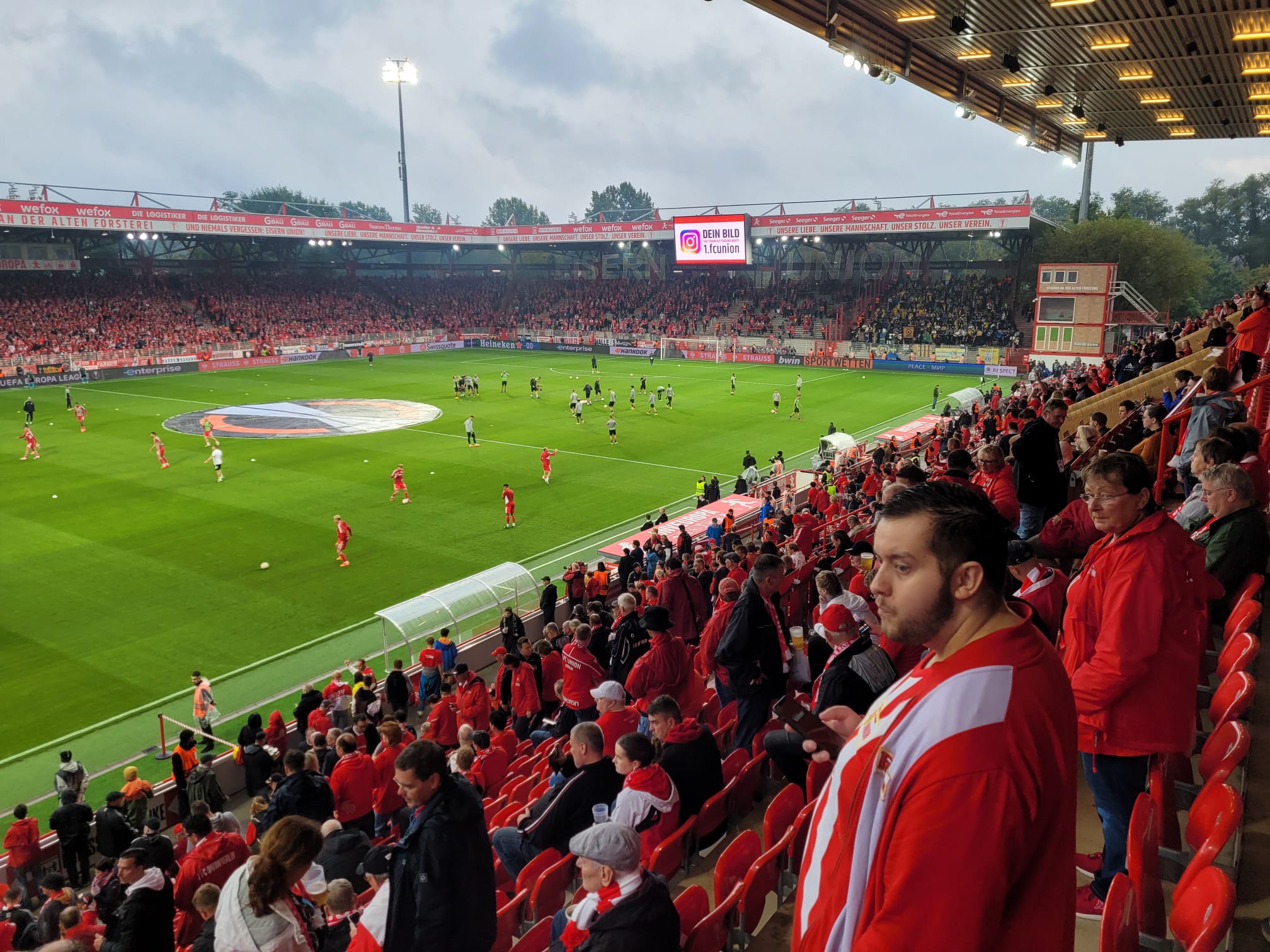 Dann ertönte endlich der sooo lang ersehnte Anpfiff. Die erste historische Europapokalminute in der Alten Försterei läuft! Nach einem schnellen Angriff der Belgier zogen sich selbige dann etwas zurück. Unsere bis in die Haarspitzen motivierten Götter suchten nun nach Möglichkeiten, das Bollwerk zu durchbrechen. In der 10. Minute der erste Torschuss von Sheraldo. Jedoch zu unplatziert landet das runde Leder in den Armen des Keepers. Nach dieser Aktion war es nun an unserem Team, die Offensive den Gästen zu überlassen. Kurze Verschnaufpause. Doch schon bald ging es weiter Richtung belgisches Tor. Eine Riesenchance in der 18. Minute. Trimmi spielt in den Strafraum, Sheraldo lässt durch und Behre kommt zum Abschluss. Leider konnte ein Belgier noch blocken. Bis zur 33. Minute hatten wir die eine oder andere Chance. Unseren Gästen blieb in diesen Minuten nicht viel Zeit zum Durchatmen. Leider konnten wir die Kugel nicht im Netz versenken. Dann gab es Freistoß für Saint-Gilloise. Der lange Ball landete auf dem Kopf eines Belgiers. Für Freddy überhaupt kein Problem!