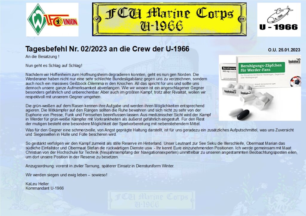Auch unter der Woche galt es für alle Marines „STRAMMSTEHEN„. Heute schon um 0800. Mit dem Tagesbefehl 02/2023 wurden unsere Marines abermals auf ein unheimlich wichtiges Auswärtsspiel instruiert. Dieser sah folgendermaßen aus: