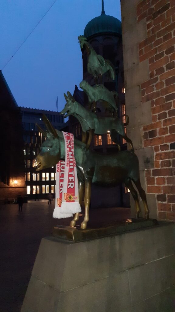 Und nun konnte es endlich losgehen: Anpfiff pünktlich 2030. Unser Team in Schwarz. Das Spiel begann alles andere als optimal. Bereits in der 13. Spielminute zappelte das Leder in unseren Maschen: Freistoß Werder, Flanke, Kopfball Pieper, Tor. Mist. 0:1 Rückstand. Puh, durchatmen und UNION-RUM rausholen. Noch waren ja 77 Minuten Zeit das Ding zu drehen. Und befehlsmäßig gab es den Vortorrum! Nur 5 Minute später glichen unsere Götter aus. Janik nutzte die Gunst der Stunde und schob eiskalt den Ball in das Tor der Stadtmusikanten. Riesendusel dann in der 21. Minute: Blankes Durcheinander in unserem Strafraum. Am Ende trudelte der Ball gegen den Pfosten. Die Gastgeber machten zu diesem Zeitpunkt aber mal so richtig Alarm. Schwerstarbeit für unsere Abwehr! Zum Glück beruhigte sich das Spiel und nach 30 Minuten plätscherte die Partie nur so vor sich hin. Zu hören waren bis dato nur die UNION-FANS im Stadion: „Schallallallalla-Schallallallalla-EISERN UNION“ hallte es durch das kühle Weserland. 36 Minuten waren absolviert, als im TV unsere Auswärtsfahrer abermals das heimische Publikum übertönte: „Wir singen rot, wir singen weiß, wir singen rot-weiß-FCU, wir singen rot-weiß FC Union, wir singen rot-weiß FCU-FCU“!!!! Kurz vor dem Halbzeitpfiff mutmaßte der Kommentator, wem dieses Unentschieden mehr nutzen würde. Nun ja, dann kam Minute 41. Abstoß Pavlenka. Kevin stellte ihn zu. Der Ball kam zu Sherry. HAMMERSCHUSS!!! in den Winkel. Aber Herr Dankert bekam einen Tipp aus dem Kölner Keller. Da war offensichtlich ein Handspiel. Herr Dankert sah sich die Situation auf Video an und entschied auf „HAND“ Hört auf, wenn das Hand war, dann weiß ich auch nicht weiter. So ein Scheiß. Ich bin echt ziemlich angefressen. Halbzeitpfiff um 2121. Bier holen, pinkeln,…