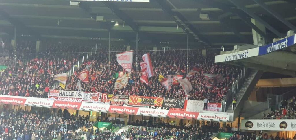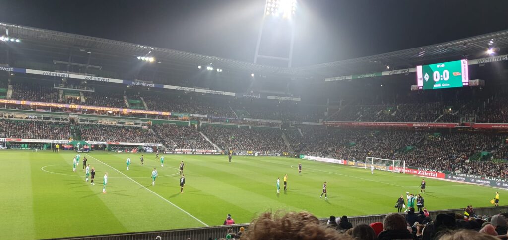 So, um 2138 ging es dann endlich weiter. Und dann gleich der erste Aufreger: Ecke Josip, Kopfball Kevin. Ball im Tor!!! 1:2. Ja Wahnsinn. Das begann ja schon mal ganz gut. Zu diesem Zeitpunkt waren wir auf Platz 2, lediglich 3 Punkte hinter den Bayern. Aber noch waren 40 Minuten zu spielen. Und Werder machte weiter Dampf. In Minute 55 Gesang aus unserem Block: „…. die erste Bundesliga ist für uns nun endlich da…“ Hammer. „Ohle-ohle-ohle-ohle-ohle-ohle-ohle-ohle-ohle-ohle-ohle-ohle-Wir sind Unioner, wir sind die Kranken, wir durbrechen alle Schranken…“ schallte es dann minutenlang im Weserstadion. In der 64. Minute Riesenchance für die Fischer-Matrosen. Flanke Scherry, Kevin kam leider nicht entscheidend zum Abschluss. Immerhin Ecke. Aber diese verpuffte. Weiter hoffen und zittern. Bremen investierte nun etwas mehr. So richtig gefährlich aber kamen sie nicht in die Nähe von Freddys Tor. Gespielt waren nun 72 Minuten. Wechsel in unserem Team: Kevin macht Platz für Jordan und Paule kam für Genki. Inzwischen Wechselgesang auf unseren Tribünen: „Schalala-schalala-hey-hey-Union“. Jetzt noch 15 Minuten. Manno, war das wieder anstrengend… 82 Minuten waren absolviert. Das Urs-Team nahm das Heft des Handelns in die Hand. Doppelwechsel in der 84. Spielminute: Andras für Janik und Jamie für Sherry. Kurze Aufregung in der 87. Minute als Nico einen Kopfstoß abbekam. Dieser blieb zum Glück ohne große Folgen. Dennoch tauschte Admiral Fischer vorsichtshalber Jerome gegen Nico. Nachspielzeit nun satte 5 Minuten. „FC Union-unsre Liebe. Unsre Mannschaft, unser Stolz. Unser Verein, Union Berlin Union Berlin“… Unsere Auswärtsfahrer gaben einfach alles. Und um 2229 konnte selbst Herr Dankert unserem Auswärtsdreier nicht mehr im Wege stehen. Leute, was für ein Mittwochabend! Nun gilt es am Samstag gegen die Alte Dame diesen unwahrscheinlichen Jahresauftakt zu VERGOLDEN. EISERN