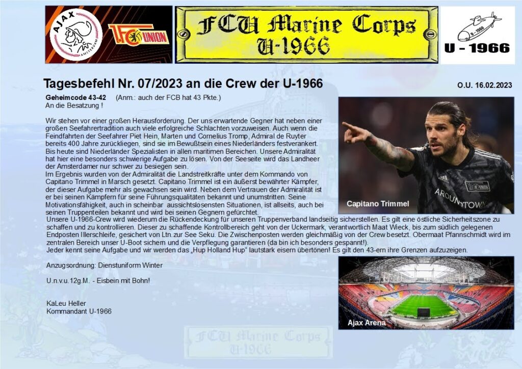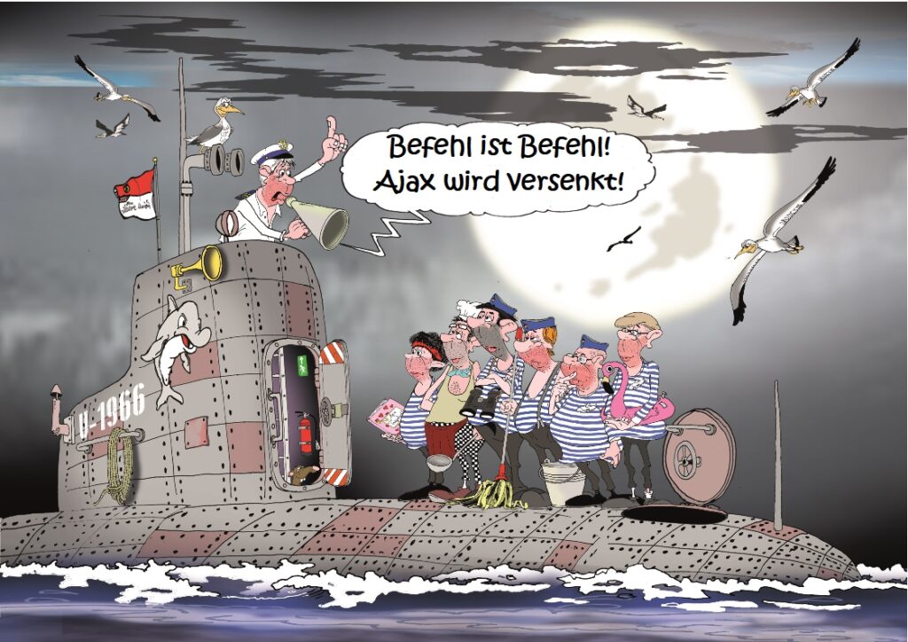 Weiter dann um 1949. Ob unsere Matrosen noch einmal solch eine Leistung darbieten könnten? Ajax begann sehr druckvoll. Kam in den ersten 10 Minuten Freddy deutlich näher. Aber nach 54 Minuten war keine glasklare Chance erkennbar. In Minute 57 „Gelb“ für Rani. Nun legten die Amsterdamer eine große Schippe drauf! Schwerstarbeit in allen Mannschaftsteilen. Auch auf der Brücke, im Marinehaus, an der Iller, in Zeuthen, im Erzgebirge… Und unser kollektiver Zusammenhalt sorgte sogar für den Führungstreffer für unsere Mannschaft: Gespielt waren 65 Minuten. Morten nutzte seine zweite Chance zur Führung: Diogo fand Sherry mit einem langen Ball auf der linken Seite. Der Angreifer machte diesen ganz stark fest und passte anschließend zu Jerome, der sofort zum zweiten Pfosten flankte. Dort nahm Morten das Leder gegen zwei Gegenspieler mit der Brust runter und setzte die Kugel mit seinem zweiten Kontakt zentral ins Netz. Unser KaLeu befahl sofort den Nachtor-Rum. Positive Fassungslosigkeiten bei allen Marines! Doch dann folgte dies: Der Schiedsrichter bekam einen Tipp aus dem Kölner Keller. Oder wo auch immer an diesem Abend der Keller stand. Der VAR witterte ein Handspiel unseres Torschützen. Und siehe da, Schiedsrichter Meler nahm den Treffer zurück. Verdammter Bockmist. Das galt es erstmal zu verarbeiten. Minute 70, Wechsel bei unseren Jungs: Jordan für Beere. Mach´s nochmal Jordan! Du kannst das!!! Wir stehen hinter dir!!! Nach 80 Minuten blieb zu vernehmen, dass Ajax zwar bemüht war, Union aber zielstrebiger Richtung gegnerisches Tor war. So, also noch 10 Minuten. Nächster Wechsel in der 82. Minute: Svenne für Sherry. Danke Sherry. Wieder ein enormes Pensum, ein wahnsinniges Tempo in den Aktionen. In der 85. Minute „GELB“ für Danilho. Nach 90 Minuten kam Nico für Jerome. Die Nachspielzeit wurde mit 4 Minuten angezeigt. Da passierte nicht mehr viel. Abpfiff. Zufriedene Marines dank des vom KaLeu befohlenen UNENTSCHIEDEN_RUM´s.
