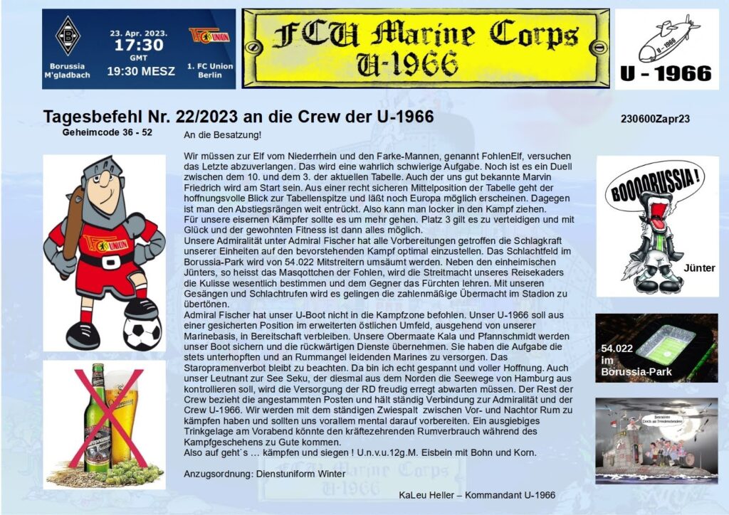 Dennoch gilt es nun. Am kommenden Samstag müssen wir ALLE beweisen, dass dieser Sieg nur ein kleiner Baustein auf dem Weg zu einer unglaublich sensationellen Saison war. Wir erwarten die Pillenmannschaft aus Leverkusen. Anstoß wird um 1530 sein. KaLeu Heller wird sein Team ordnungsgemäß einteilen. Warten wir ab. Der nächste LOGBUCHEINTRAG wird berichten.