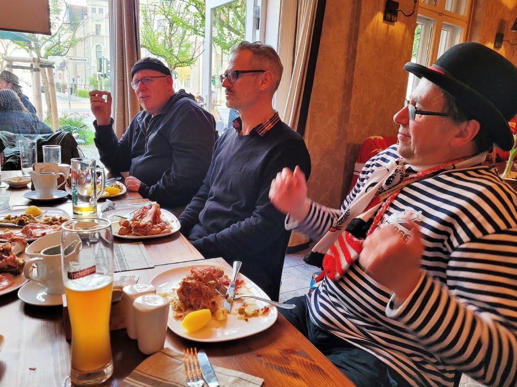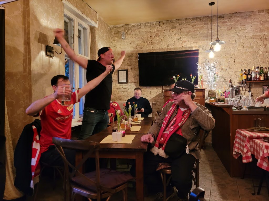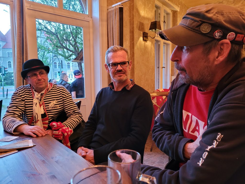 Bericht von Gestern. Trotz der scheinbar kürzeren Anfahrt mit der BVG, also ohne unzählige Viktoria-Biere wurde es wieder später als gedacht. Nach Straßenbahnstau erstmal ein Flaschbier bei Union-Ali. Dann ins Stadion. Nach Becher-Berliner und Fischbrötchen als Spielvorbereitung ging es in die AF-Arena. Das Spiel habt ihr ja gesehen und der Seku kann das auch viel besser beschreiben. Wir hatten lediglich die Hoffnung auf einen Sieg der uns Europa näher bringt. Aber das Unentschieden geht dann in Ordnung und wenn man diverse Großchancen nicht nutzen kann bleibt es beim Ein-Punkt-Gewinn. Nach dem Spiel noch einen kurzen Absacker und ein lecker Fischbrötchen, bevor es auf kürzestem Weg ins Coe 2.0 ging. Dort waren zuerst wenige, was sich aber schlagartig änderte. Nussi brachte Besuch zum Eisbeinessen mit. Friedrich mit seiner Partnerin waren sehr interessante Gesprächspartner. Ein Union-Fan aus München eben. Dazu gesellten sich noch Sam, Maat Tilo, Teichi, Phillip (Schnuppe), Erik (Keule) und viele andere. So verging die Zeit wie im Fluge und unsere Besatzung konnte neue Fans für unsere gute Sache gewinnen. Das alles begleitet von Bananenweizen und auch noch einen Schnaps dazu. Mein Heimweg war wie gewohnt etwas länger aber ohne Vorkommnisse. Ankunft 0030. Heute gehts mir aber super und die Sonne scheint… ab in die Jungfernheide zum Treffen ohne Fahrräder, was ein Novum darstellt. Auf ein neues dann und dann mit etwas mehr Torausbeute …