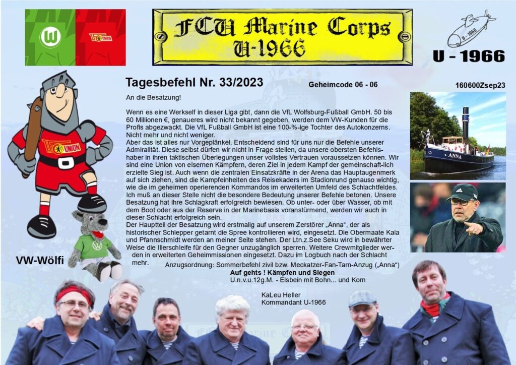 Es gibt halt so Spiele, die eigentlich den Adrenalinspiegel nicht wirklich in die Höhe treiben. Und so ging es unserer Crew am heutigen Spieltag. Auswärts in Wolfsburg. Als sich ein kleiner Schlendrian in den Köpfen der Marines Einzug festsetzen wollte, mahnte unser KaLeu zur absoluten Vorsicht und befahl unmissverständlich, den Tagesbefehl zu studieren und dann auch entsprechend umzusetzen. Besagter Tagesbefehl sah dann wie folgt aus:
