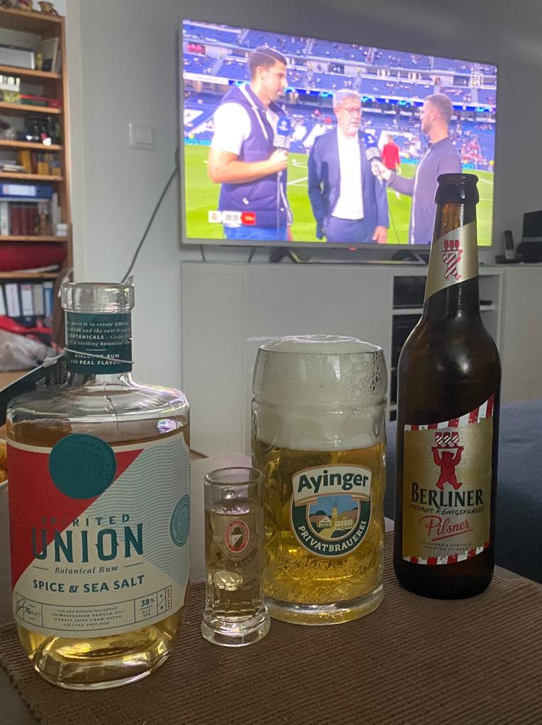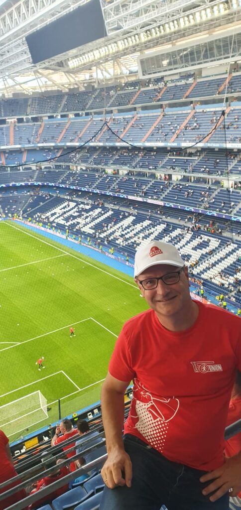Endlich mit meinem Zwilling in Freund Roberts juter Stube: Auf dem großen Bildschirm erklärt Ranis Bruder Urs Fischer, wie er vorgehen muss. Urs grient sich eins, entscheidend für mich einer seiner Sätze im Vorfeld der Partie: „Aber Du musst es Dir zutrauen!“ Der Kommentator spricht von 6-10.000 Unionern im Bernabeu, von „bombastisches Madrid gegen bodenständiges Union.“ Nette Folklore, aber es seien noch Hunderte unserer Auswärtsfahrer noch nicht ins Stadion gelassen worden.