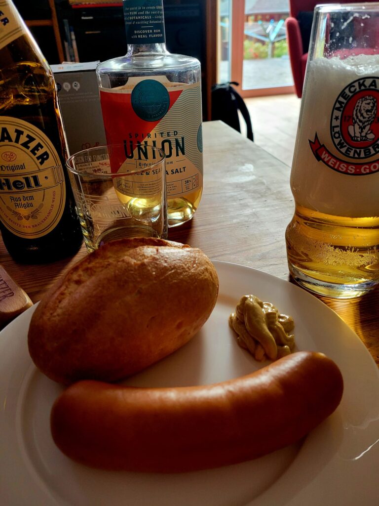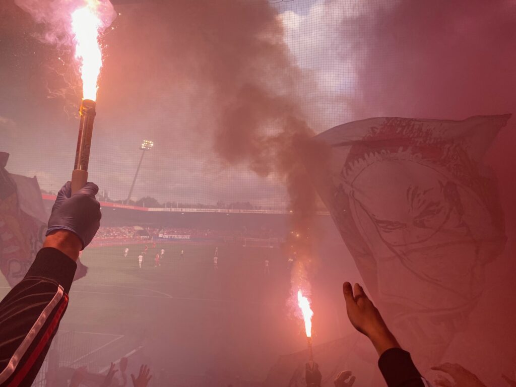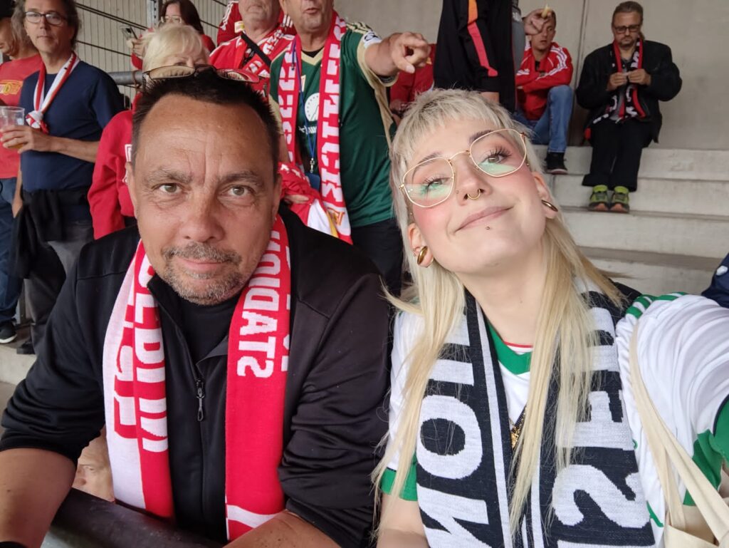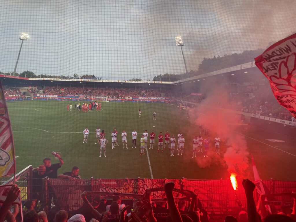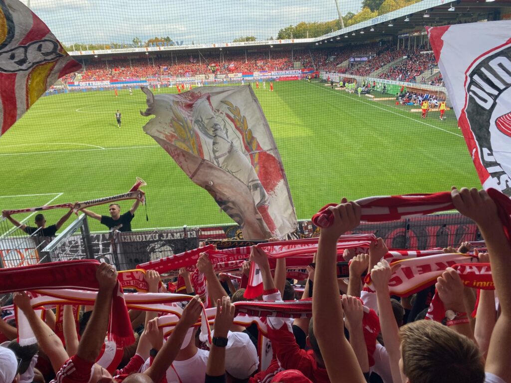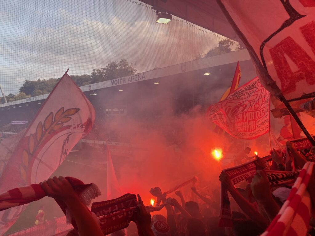 Was nun folgte war ein Potpourri unseres reichhaltigen Gesangsrepertoires… Zum Glück für mich, dass da nichts Neues dazukam. Also sang ich freudestrahlend und lautstark mit. Was sollte ich auch sonst tun? Dank brennender Fackeln und wehender Fahnen war vom Spiel nichts zu sehen. Aber ganz ehrlich, mich störte das gar nicht so. Mein letztes Unionspiel war am 26.02.2023 auswärts in München. Also schon n bissel her. Und da tat es heute mal so richtig gut, die Stimmung aufzusaugen, die Mannschaft nach vorne zu peitschen. Meine Begleitung entschuldigte sich ab und an, sie habe eine Mädchenblase. Ich fands gar nicht schlimm! Denn immer, wenn sie erleichtert zurückkam, hatte sie ein Bier für mich im Gepäck… Ja und dann war auch schon Halbzeit.