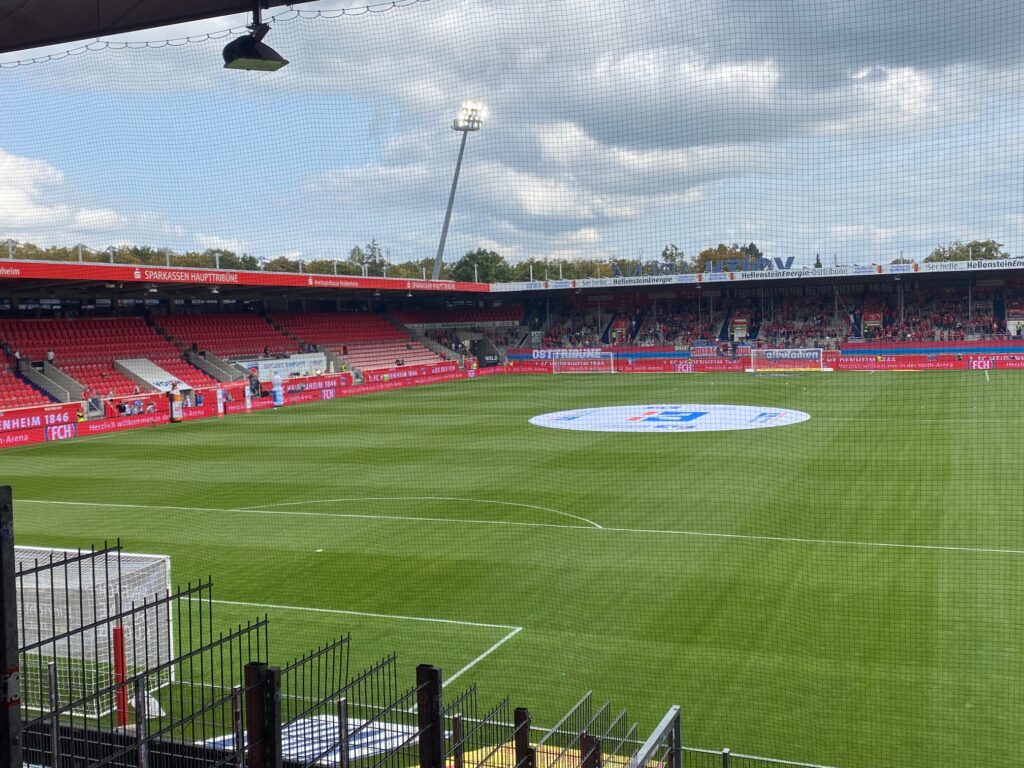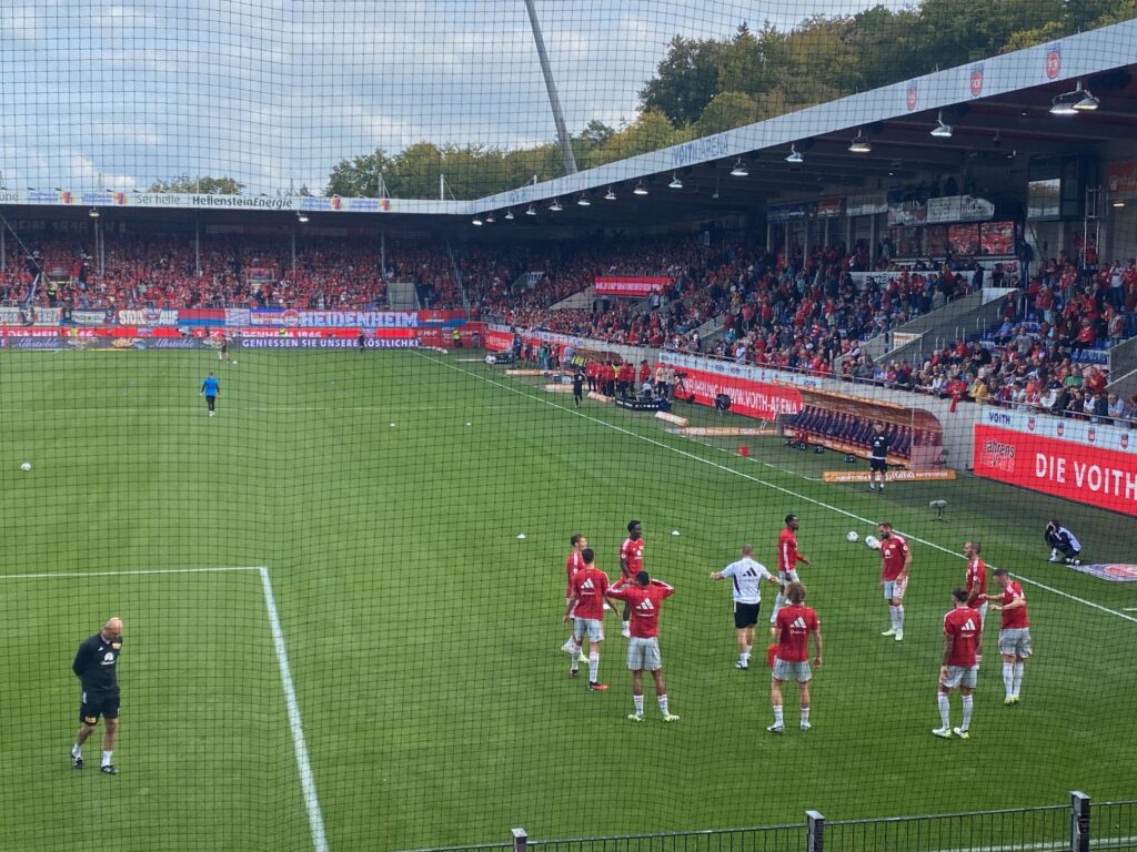 Unser Leutnant machte sich also auf den Weg vom Bahnhof zur Voith-Arena. Sehr romantisch durch eine Fußgängerzone, dann hinauf zum Schloss Hellenstein. Dann durch eine ruhiges Waldstück gelangter er zum Schauplatz des heutigen Kräftemessens. Und von da an war alle Romantik vergessen. Ein riesiger Parkplatz umsäumte einen hässlichen Betonklotz. Doch dann ein Lichtblick: Unser Leutnant traf eine gute Freundin aus seiner Berliner Vergangenheit. Gemeinsam begaben sie sich in den Gästeblock. Es gab unendlich viel zu erzählen.