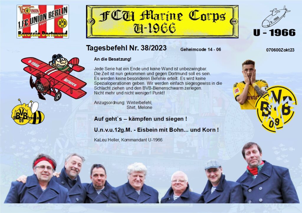 - Unser Anhang skandierte zu diesem Zeitpunkt gerade: „Vorwärts-vorwärts-Fußballclub Union- hey- Fußballclub Union-hey-Fußballclub Union…“ und vom KaLeu kam postwendend der Befehl – Vortor-Rum für ALLE