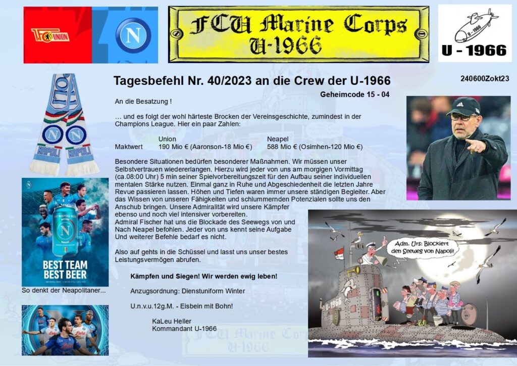 Am 3. Spieltag der Champions-League trafen wir auf keinen Geringeren als den amtierenden Meister der Serie A. SSC Neapel! Und wir mussten wieder in die ungeliebte Schüssel im Westteil unserer wunderschönen Hauptstadt. Charlottenburg war abermals Ziel unserer Feindfahrt. KaLeu Heller brütete nächtelang für einen passenden Tagesbefehl. Schlussendlich sah er dann wie folgt aus: