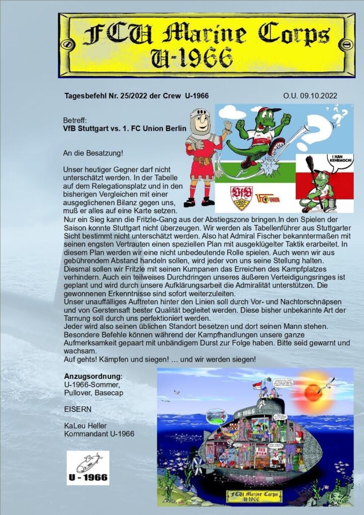 Maat Tilo meldete nach überstandener Corona-Infektion absolute Gefechtsbereitschaft mit folgender Nachricht: „Der Tee ist abgesetzt, der Kaffee schmeckt langsam wieder. Da Schnaps eine Art Medizin ist und die Seemänner mit Rum wieder aufgepäppelt wurden, bin ich dann heute zum späte Nachmittag kampfesbereit. EISERN.“ Die restlichen Marines hielten sich sehr konsequent an die Funkstille und waren sich ihrer Aufgaben bewusst. Also die Seewege nach Stuttgart waren gesichert! Ja und dann ging es auch schon los: Schiedsrichter Bastian Dankert eröffnete die Partie um 1933. Zuvor wurde noch Jürgen Sundermann gedacht, der in früheren Jahren Trainer beim VFB war und letzte Woche verstarb. Zunächst war klar, dass unsere Jungens mindestens ein Pünktchen aus Stuttgart mitnehmen müssten, um die Tabellenführung dem FC Freiburg wieder abzunehmen. Um es hier noch einmal in aller Deutlichkeit zu schreiben: Wir reden vom 9. Spieltag der 1. Fußballbundesliga! Und wir als kleiner Köpenicker Verein reden (schreiben) von der Rückeroberung der Tabellenspitze! Absolut verrückt! Also das Spiel begann. Alle Marines auf ihren Posten. Aber unsere Kicker wirkten etwas müde. Der VFB hatte die ersten 45 Minuten eindeutig für sich entschieden. Wir hatten da echt das Glück des Tüchtigen. Zu erwähnen wären da ein Kopfball, ein Freistoß (Riesenparade von Frederik) und ein Pfostentreffer der Stuttgarter. Dann war Halbzeit. Weiter ging es um 2034. Unsere Mannen kamen wie ausgewechselt aus der Kabine. Sie nahmen das Heft des Handelns in ihre eigenen Hände. Auch unsere Crew gelobte Besserung. Unser Kaleu ging einmal mehr mit sehr lobenswertem Beispiel voran und verkündete weitere Maßnahmen seinerseits: „Wieviel Vortor-Union-Rum bedarf es für ein Tor? Einfach anstrengend aber muss wohl …“ Auch der Leutnant zeigte sich solidarisch, als Seekadett Nussmann um Hilfe bat… Bei so viel flüssigem Einsatz war es nur eine Frage der Zeit, bis unsere Kicker ein Tor schießen würden. Auch Admiral Fischer erkannte, dass punktuelle Veränderungen das Team etwas beflügeln könne. Doppelwechsel in Minute 65. Kevin und Morten rein, Jordan und Andras Feierabend. Dann kam Jamie in Minute 73 für Sherry. Alles Positionswechsel. Admiral Fischer blieb seiner Linie treu. Und das zahlte sich aus! Eckball in der 77. Minute. Eine Lehrbuchecke von Nico köpfte der heranstürmende Paul unhaltbar in das lange Eck! Geiles Tor, welches gleich wieder allgemeines Anstoßen unserer Crew zur Folge hatte… Riesenschreck in der 79. Minute, als der Ball im Stile einer Billardkugel durch unseren Strafraum hin und her torkelte, um dann am Pfosten abzuprallen. Puh, durchatmen und noch einen kleinen Rum eingießen. In der 4- minütigen Nachspielzeit hatten Jamie und Milos die Entscheidung auf dem Fuß. Aber es sollte nicht sein. So wurde es noch einmal spannend, als den Hausherren ein Freistoß zugesprochen wurde. Der Stuttgarter Keeper eilte mit in Nähe unseres Strafraumes. Aber der Ball konnte abgewehrt werden und kurze Zeit später pfiff der Schiedsrichter die Partie ab. Fazit: Nun gut, der VFB hätte sich sicherlich einen Punkt verdient. Aber danach fragt keiner mehr. Mit weiteren 3 Punkten im Gepäck fährt es sich natürlich sehr angenehm zurück in die Heimat. Nach nur 9 Spieltagen haben unsere Jungs bereits 20 Punkte! Es fühlt sich so was von unbeschreiblich an… Und unsere Marines werden heute trotz erheblicher Kopfschmerzen ihren Mann stehen und sich akribisch auf den Donnerstag vorbereiten. Da geht es im Heimspiel gegen Malmö um weitere Europapokalpunkte. Da für dieses Spiel eher mit nördlichen Attacken zu rechnen sein wird, befahl der Kaleu unseren Leutnant nach Berlin, um vor Ort die noch geheimen Befehle auszuführen.